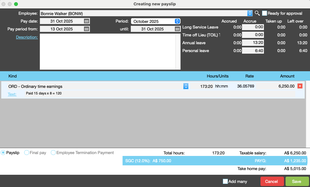 | ORD – Ordinary Time Earnings | Update this to reflect the number of hours or days the employee should be paid for in their first month. | 15 days × 8 hours = 120 hours |