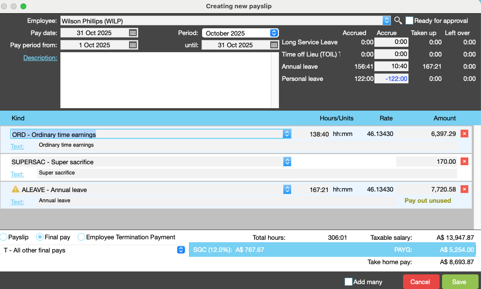 - Personal leave should be zeroed out ( top right) as it is not paid on termination.