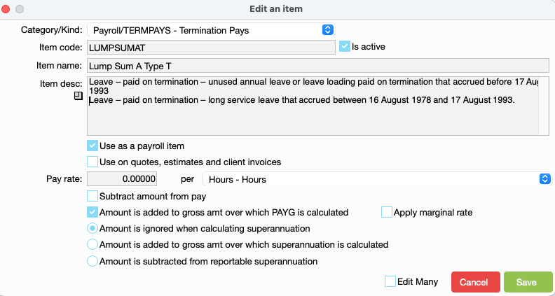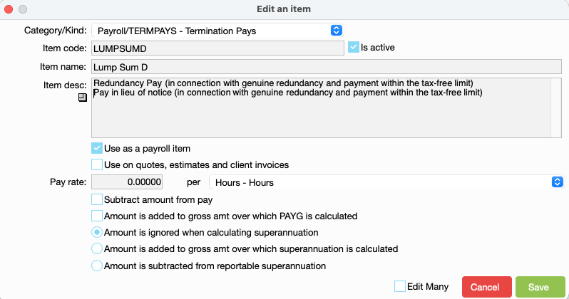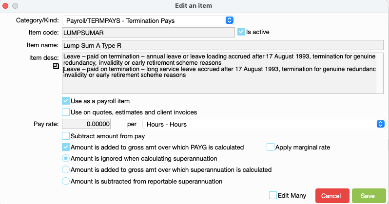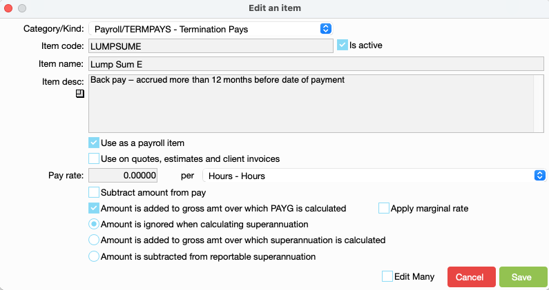 There are special codes for the lump sums and annual leave paid upon resignation or redundancy. The codes are required for the reporting to the ATO. The codes are: Lump Sum - this type of income is irregular, one-off, non- periodic remuneration for employees.