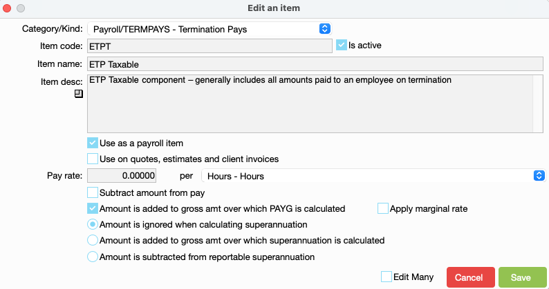 | ETP Taxable component | ETP Taxable component – generally includes all amounts paid to an employee on termination |