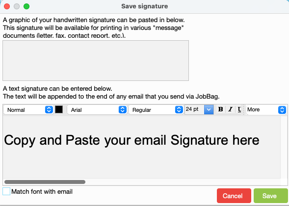 Navigate to:File > Preferences > User Preferences > Enter Your JobBag Password > Signatures
