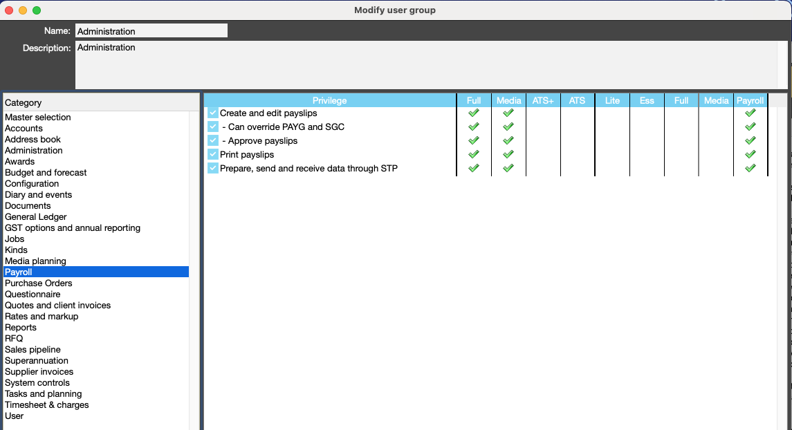 Payroll privileges control who can access, edit, and process payroll within JobBag. These settings ensure only authorised users can view employee details, create payslips, run payroll, or submit STP. Because payroll permissions sit across multiple categories, we recommend creating a dedicated Administration/Payroll user group and assigning the appropriate payroll privileges to your authorised payroll team. This protects sensitive employee data and ensures payroll is managed securely and accurately.