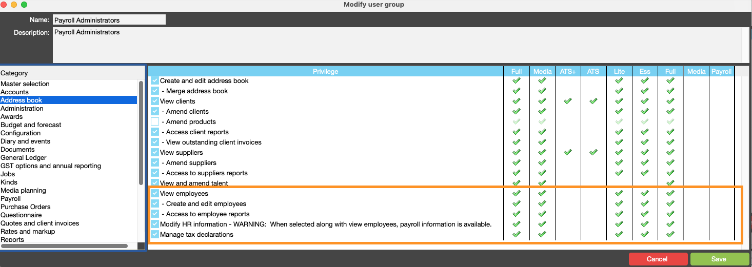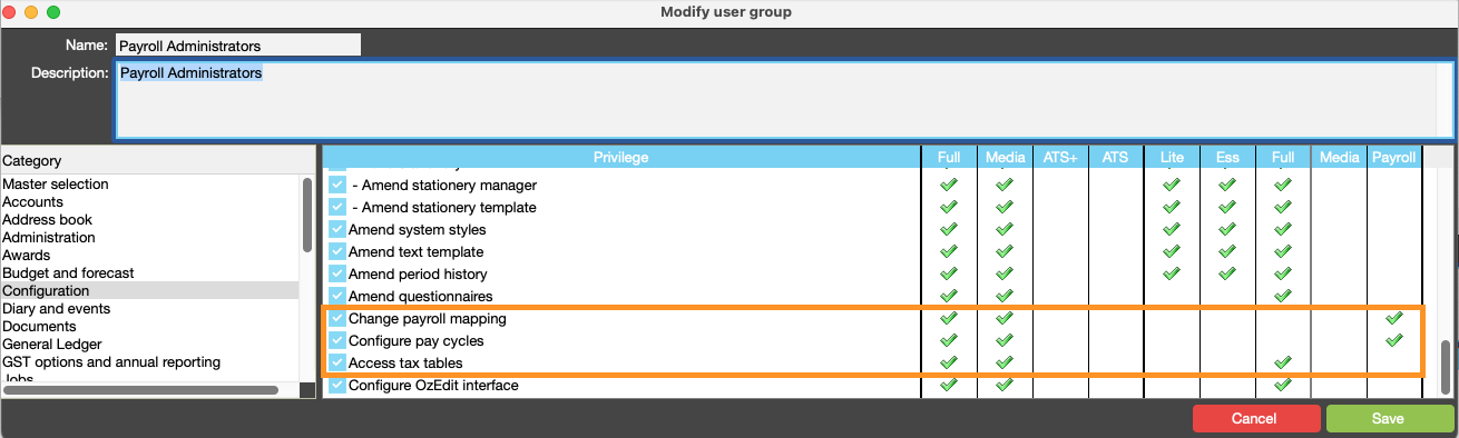 Payroll privileges are located across several categories. Address Book/ Configuration/Diary and Events/Payroll/Superannuation
