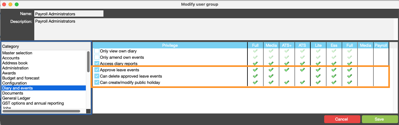 | Approve superannuation | If selected the user will be able to approve superannuation payments to superfunds |