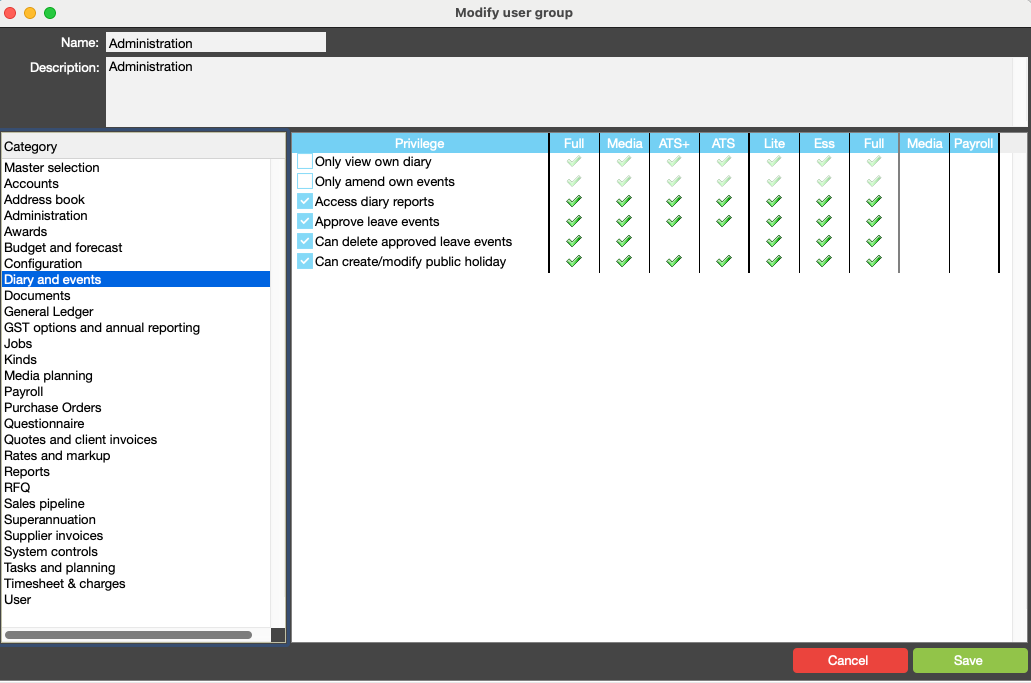 The Dairy and events privileges allow users access to the active dairy, request leave from the active dairy and JBX leave. These privileges will also allow some users to manage and approve leave events in JobBag.