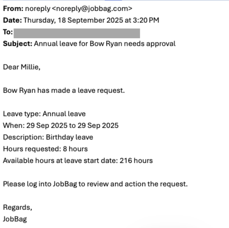 The Approving Manager receives an email notification advising that a leave request is awaiting approval.