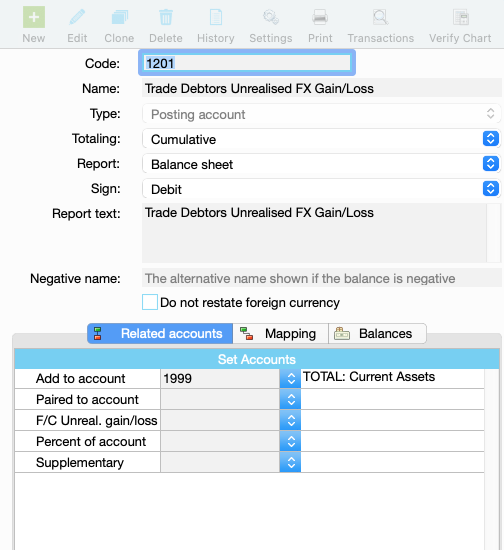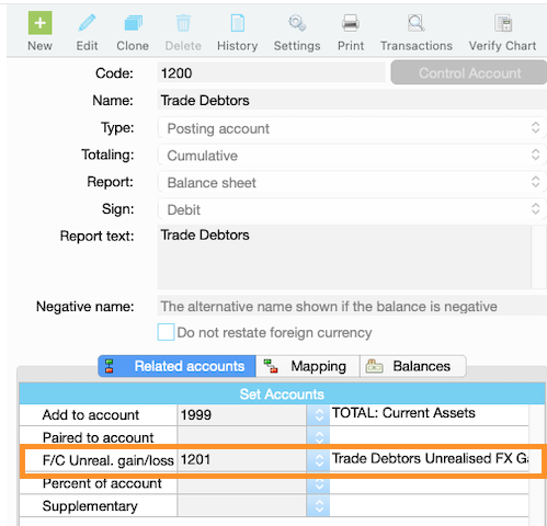 Repeat Steps 1–2 for any other foreign currency balance sheet accounts (for example, Trade Creditors, foreign currency bank accounts, GST accrual and divisional), creating a dedicated unrealised gain/loss control account for each and mapping it accordingly.