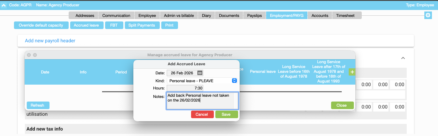 Navigate to: Employee File > Employment/PAYG tab > Accrued Leave